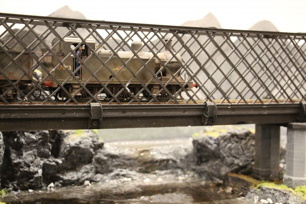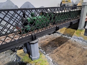 One of our members first attempt at an O gauge layout, built primarily as a test track with 9′ of scenic and two traversers. The main bridge was inspired by the Lattice viaduct bridge at Dalguise and was contructed from plywwod and 3D printed lattice panels and towers. The river section was made using castable resin, with plaster cast rock abutments.